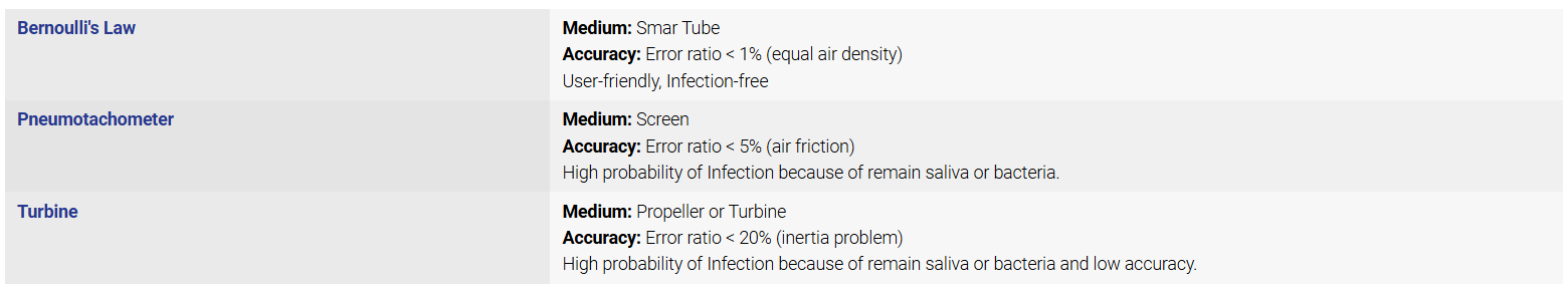 - اسپیرومتری مدل SPM7 کمپانی Bionet دارای قابلیت استفاده از سنسور برنولی با درصد خطای بسیار كمتر نسبت به سایر سنسورها و بدون ایجاد آزار و ناراحتی برای بیمار در حین تنفس؛ در ضمن این سنسور در انواع یكبار مصرف (جهت از بین بردن احتمال سرایت بیماری) و انواع قابل ضدعفونی موجود میباشد.